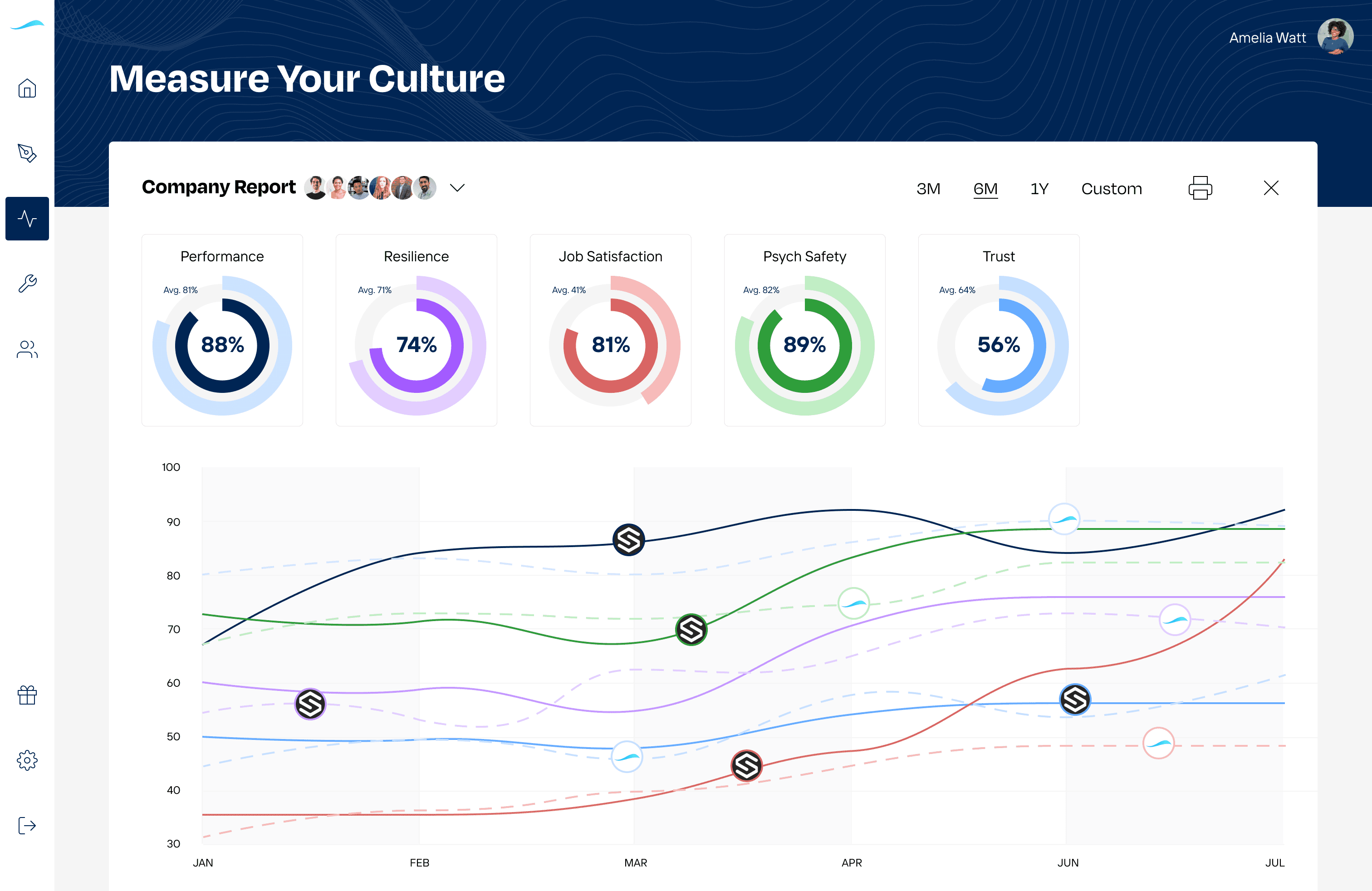 Measure and predict your company's vital signs such as psychological safety, trust, resilience, burnout, etc.